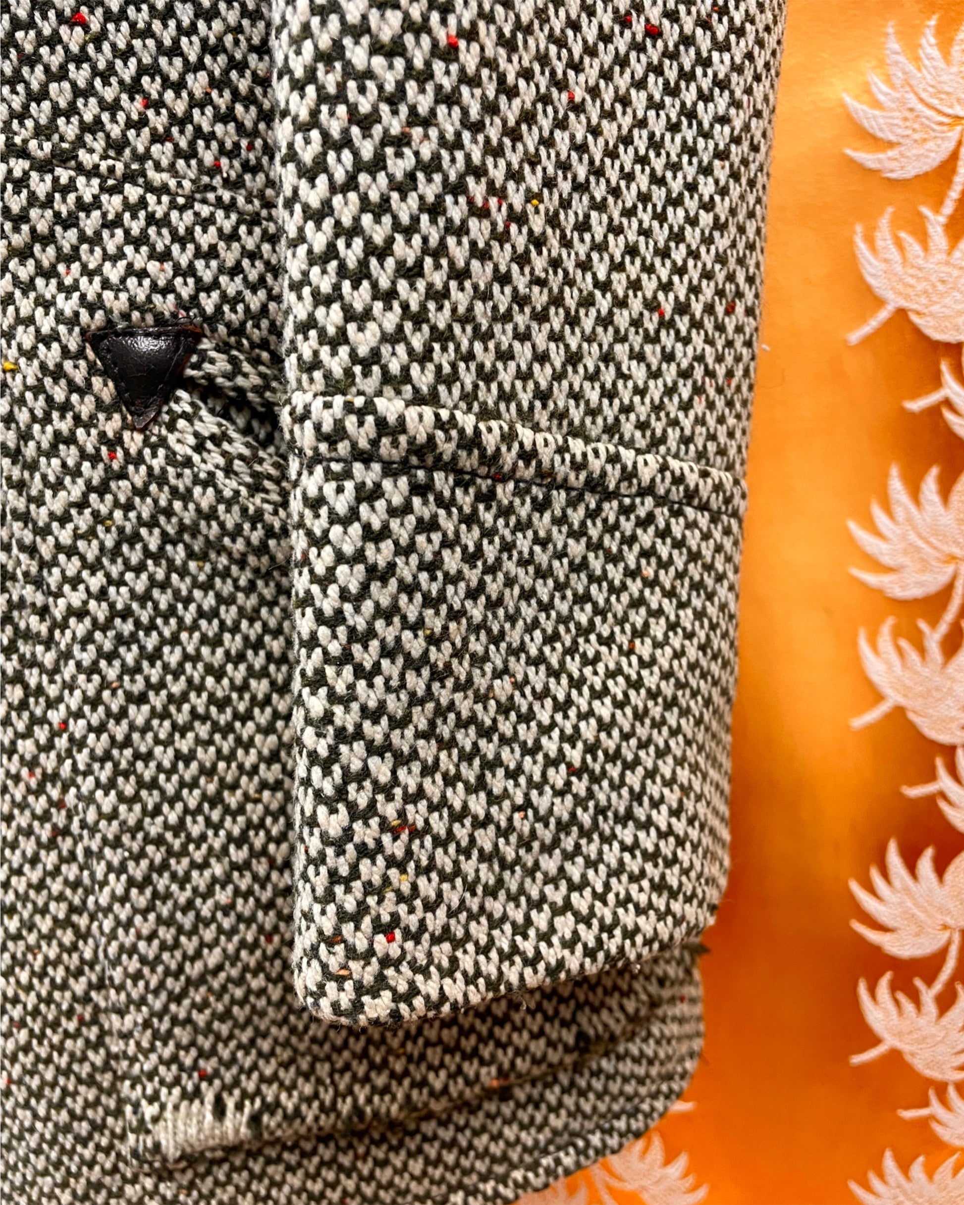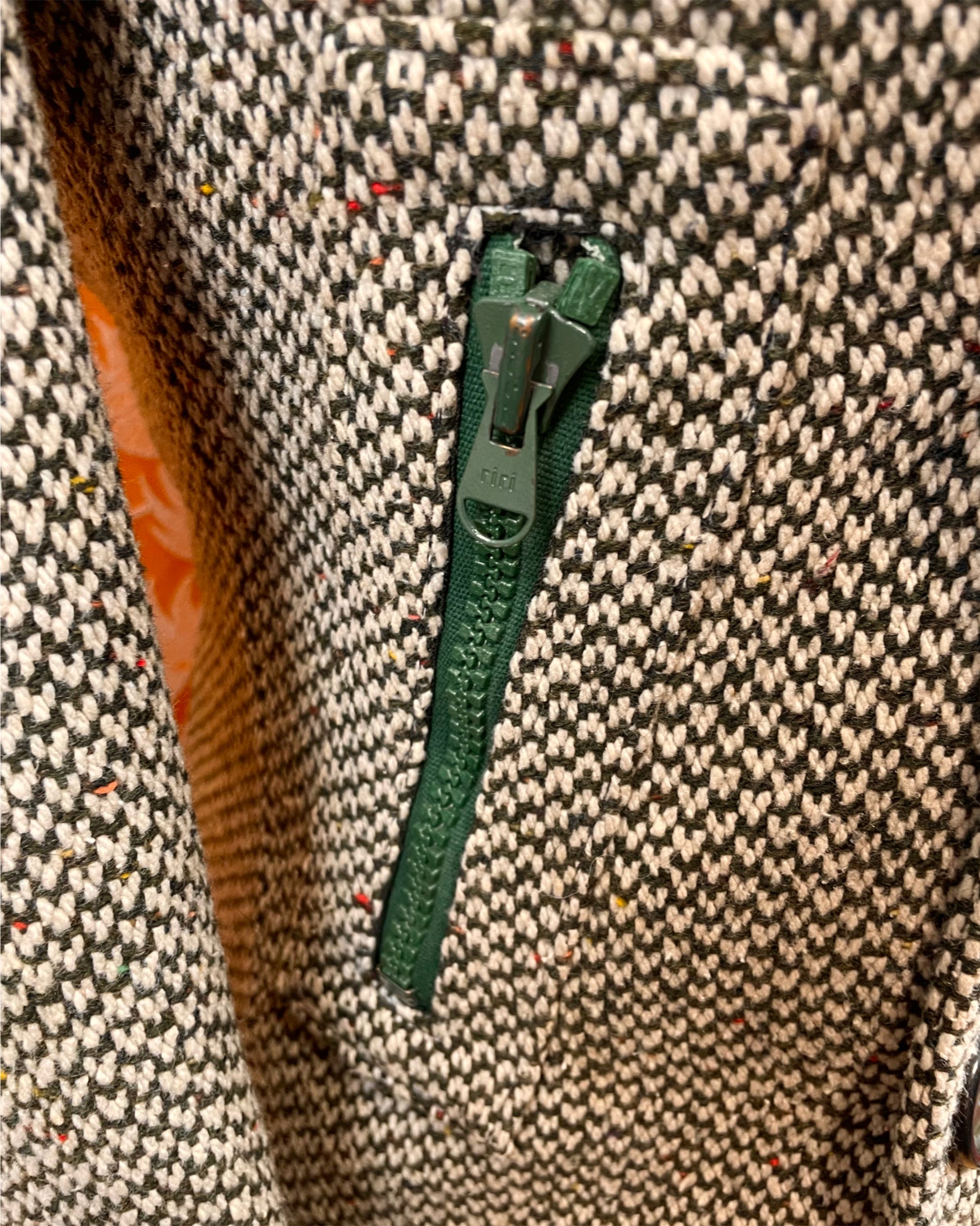 Next tonight, we have this utterly unbelievable late 60’s/early 70’s wool driving coat! This is such a standout piece and I’ve never seen one quite like it before. The detailing here is so unique from the green zips to top button, offset by the black and white spec coloured fabric with red and yellow highlights. The quality of this is fantastic, the wool feels really hard wearing and durable yet light and easy to wear. There’s no label present but it appears to be German made, it just screams Micheal Caine in the Italian Job for me! This one won’t stick around long so don’t hesitate if this is for you!